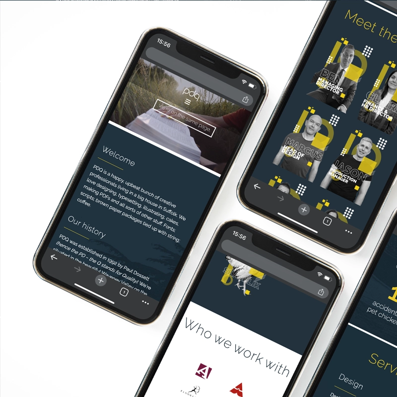 Over the years I was with PDQ, the website was altered to include a snow overlay for Christmas, a hero video for the home page, and an extensive catalogue of work samples – which was also removed during my tenure.